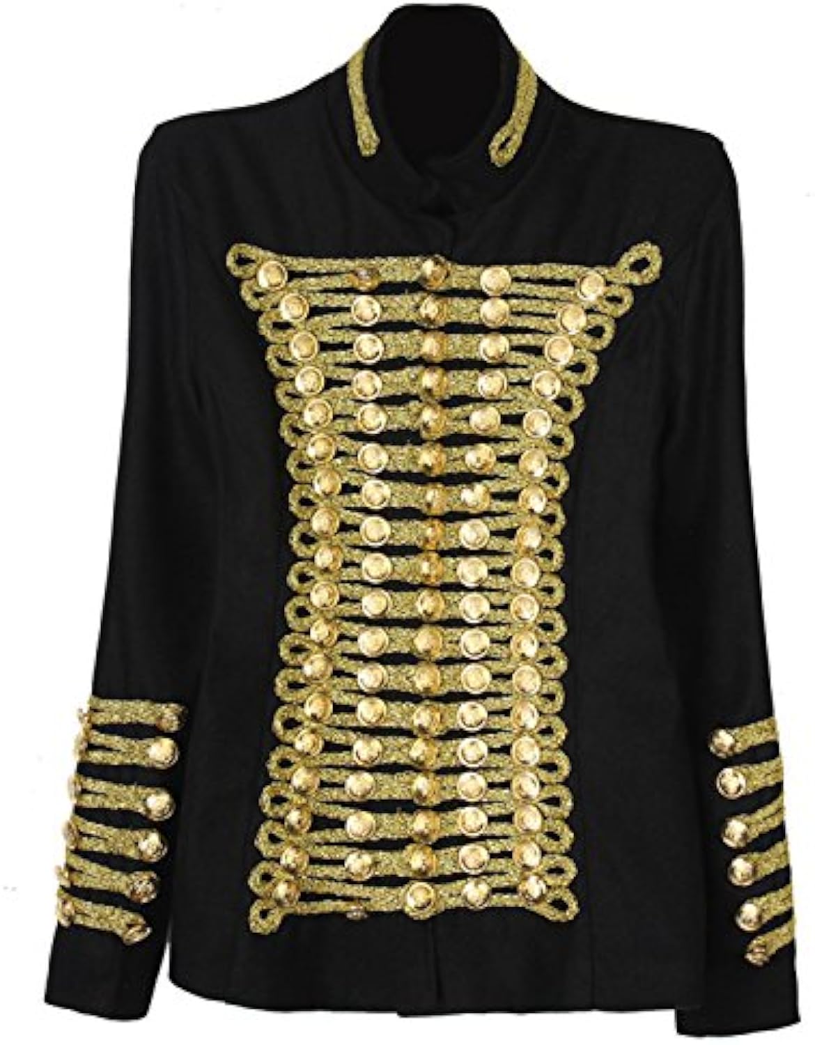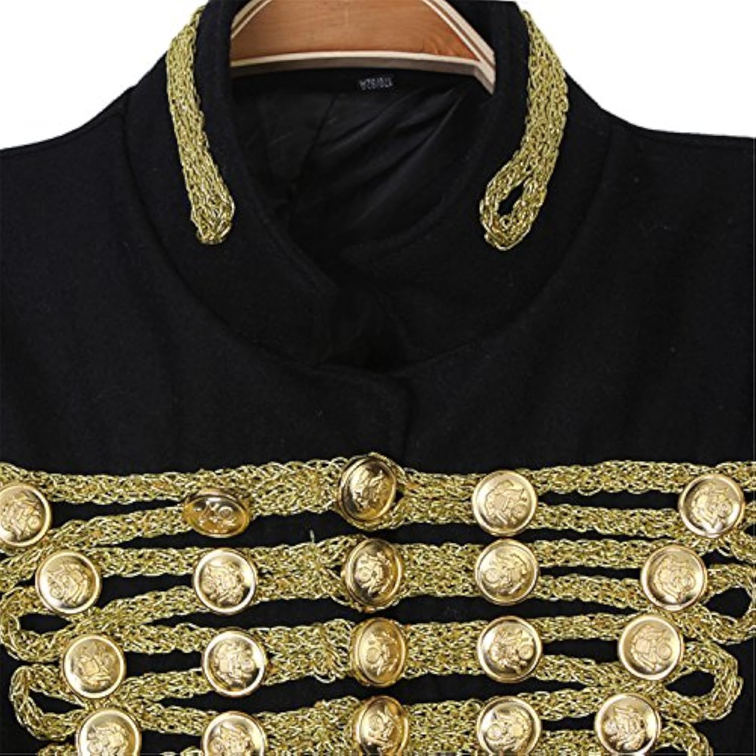 • Design: Black color, military - style, extensive gold braiding and button embellishments on front and cuffs, gold - trimmed high collar