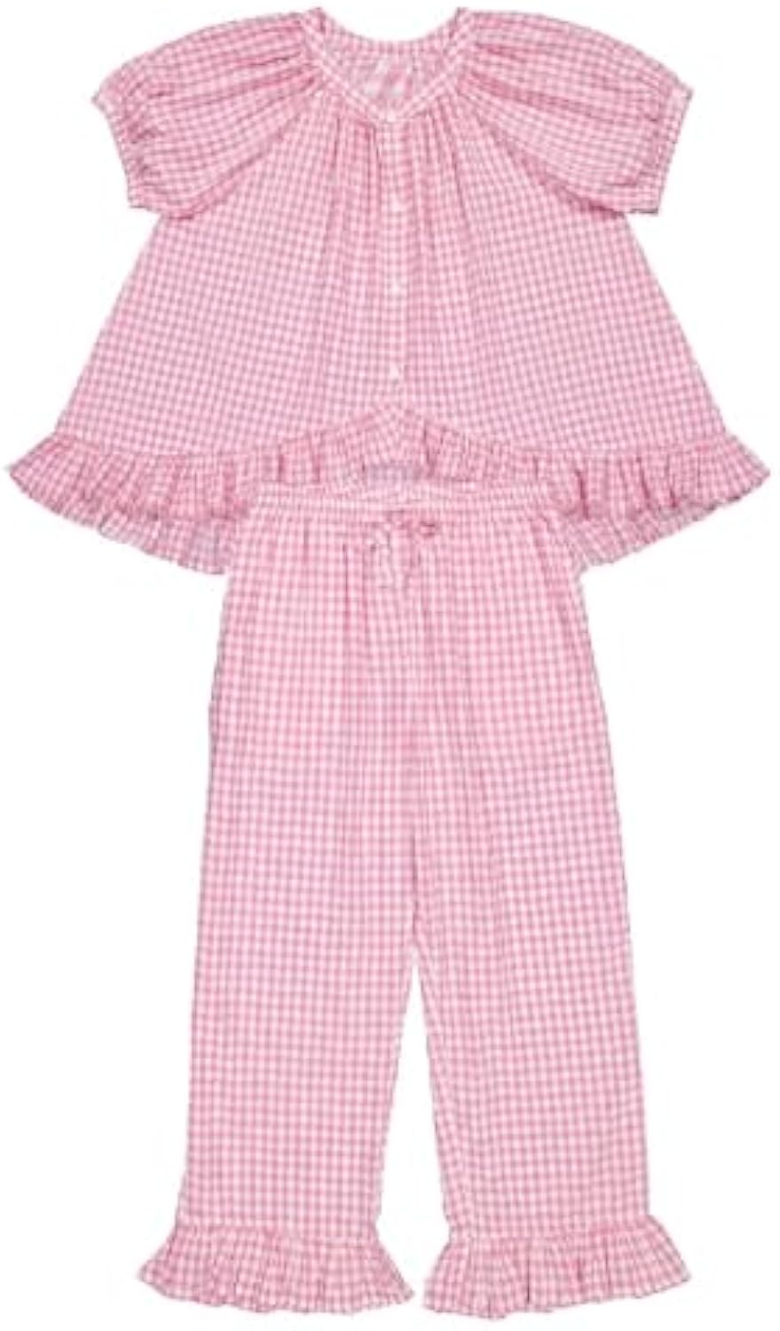 Design: Pink gingham pattern, button - front top with puffed sleeves and ruffled hem, matching pants with ruffled cuffs
